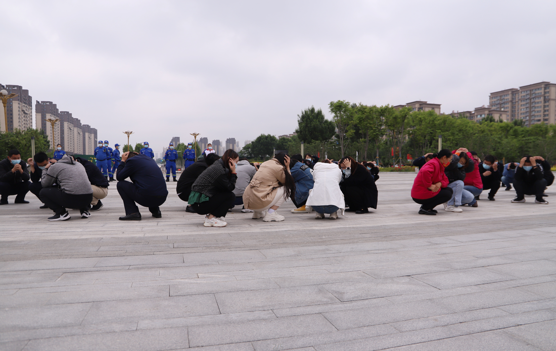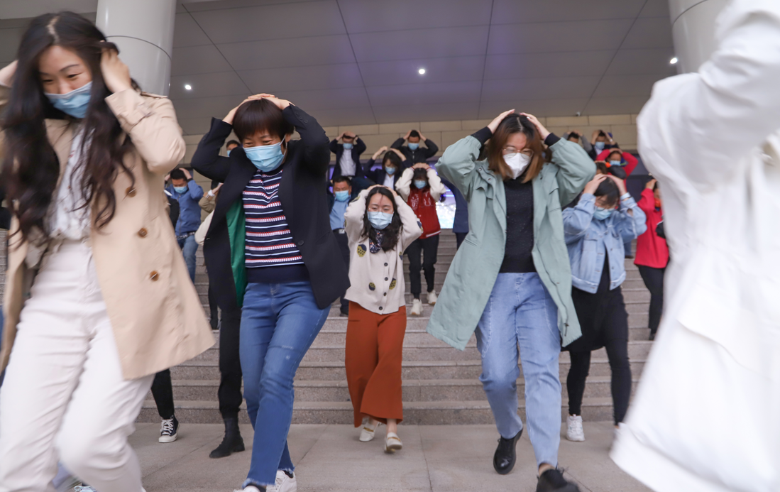 演練開始后,當聽到地震緊急避險警報,集團員工就近避險,迅速抱頭、閉眼,躲在桌子下,盡量蜷縮身體,降低身體重心,保護頭部。在聽到緊急疏散警報后,全體員工在藍天救援隊的指揮下,雙手抱頭,或用文件夾、筆記本等物品遮擋保護頭部,快速有序的撤離辦公場所,到達指定避險集結安全區(qū)域。